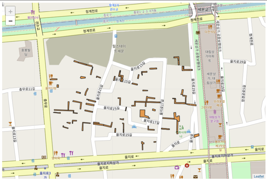 여튼, 이렇게 오픈스트리트맵 위에 QGIS에서 그린 객체를 가져오는 데 성공했다.